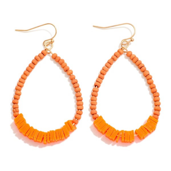 Beaded Teardrop Drop Earrings Featuring Wood and Puka Shell Beads