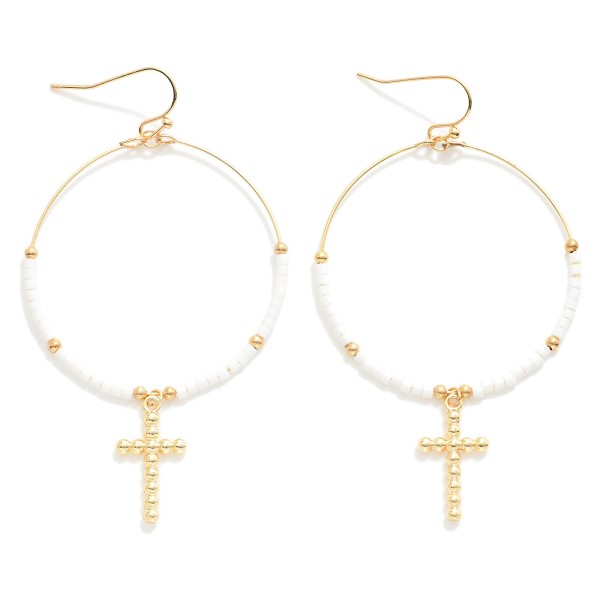 Beaded Wire Hoop Drop Earrings With Ball Cross Charms