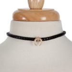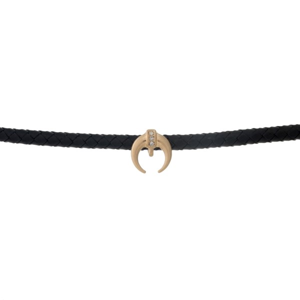 Black braided leather cord choker necklace with a crescent pendant. Approximately 13" in length