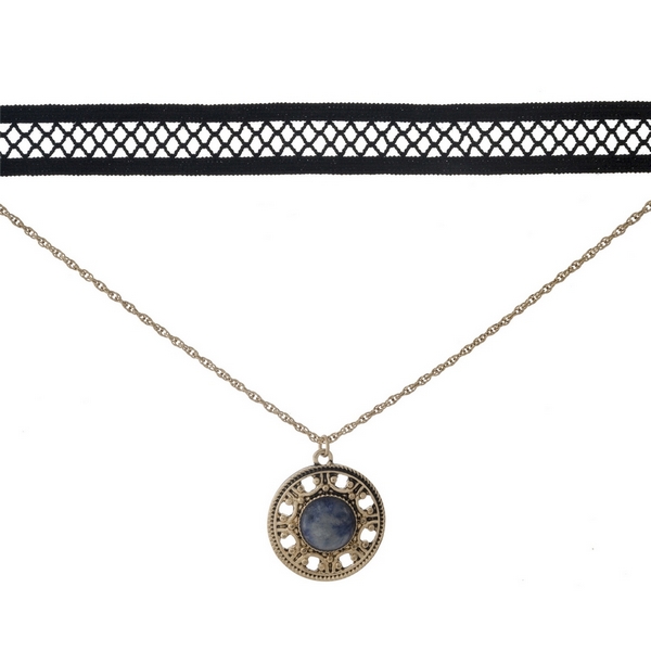 Black and gold tone, double layer choker with a circle pendant, accented by a blue stone. Approximately 12" in length.