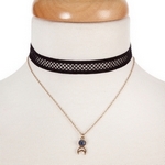 Black and gold tone, double layer choker with a crescent cut out pendant, accented by a blue stone. Approximately 12" in length.