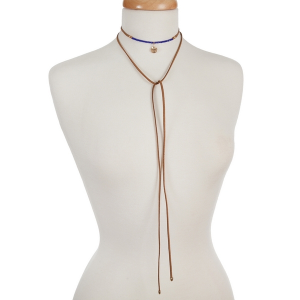 Brown wrap choker necklace with royal blue beads and a circle pendant. Approximately 60" in length.