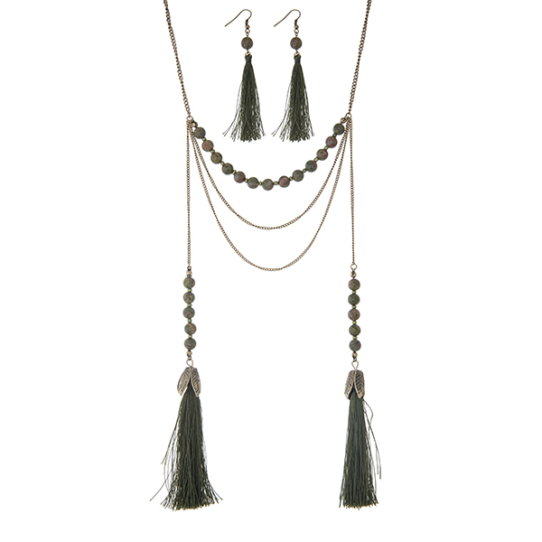 Burnished gold tone layering necklace set displaying green and brown beads with two 3 1/2" fabric tassels. Approximately 28" in length.