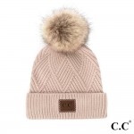 Diagonal Stripe Knit Pattern Pom Beanie with C.C Brand Leather Patch.