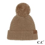 Waffle Knit Pattern Cuff Beanie With Fur Pom