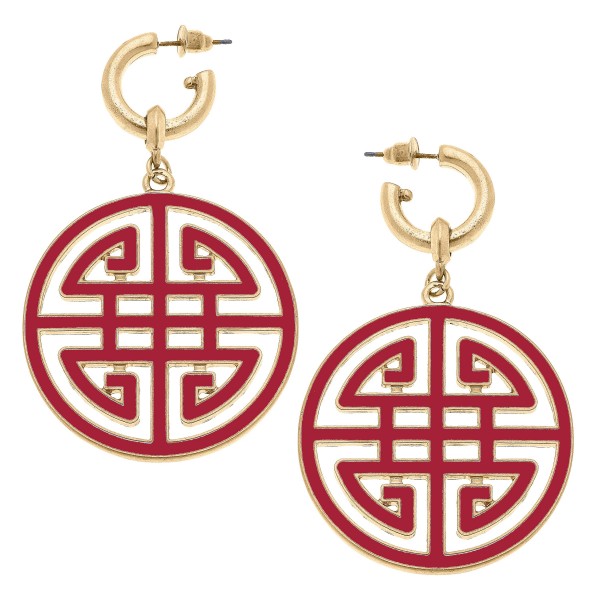 Camille Huggie Hoop Drop Earrings Featuring Large Enamel Greek Keys Charms.