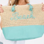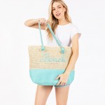 Canvas & Woven Straw Tote Bag With Rope Straps Featuring Sewn Rope "Beach" Detail