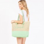 Canvas & Woven Straw Tote Bag With Rope Straps Featuring Sewn Rope "Beach" Detail