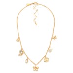 Chain Link Charm Necklace Featuring Metal Tone Charms, Rhinestones & Pearl