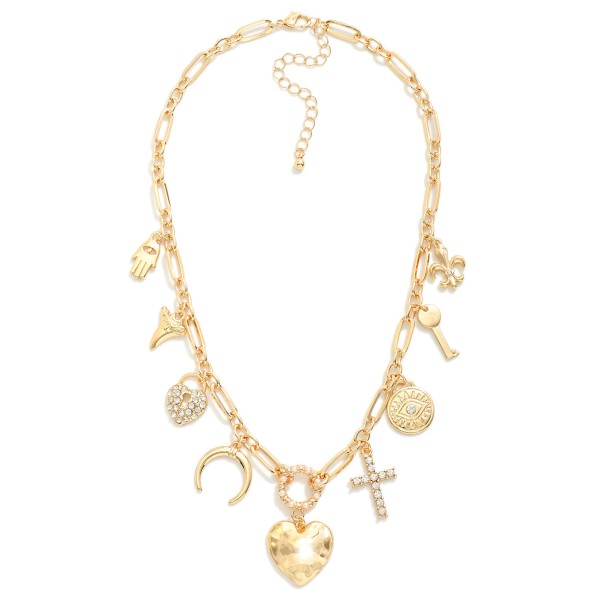 Chain Link Charm Necklace Featuring Metal Tones, Rhinestones, & Pearls