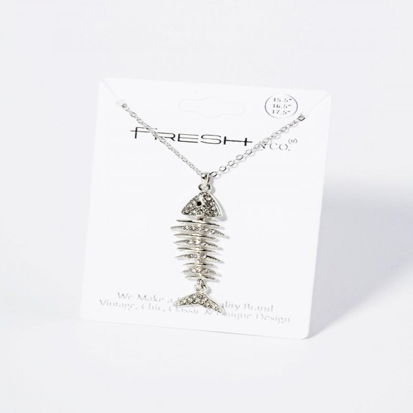Chain Link Necklace Featuring Rhinestone Studded Fish Skelton Pendant