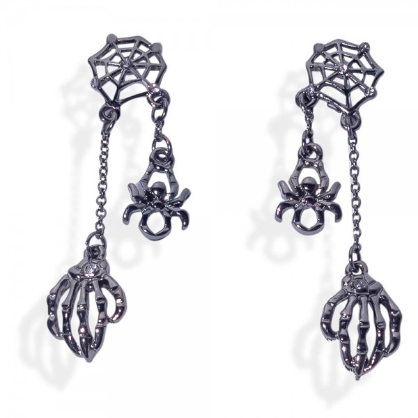 Chain Link Skeleton Hand & Spider Post Drop Earrings Featuring Spider Web Post
