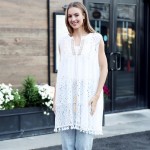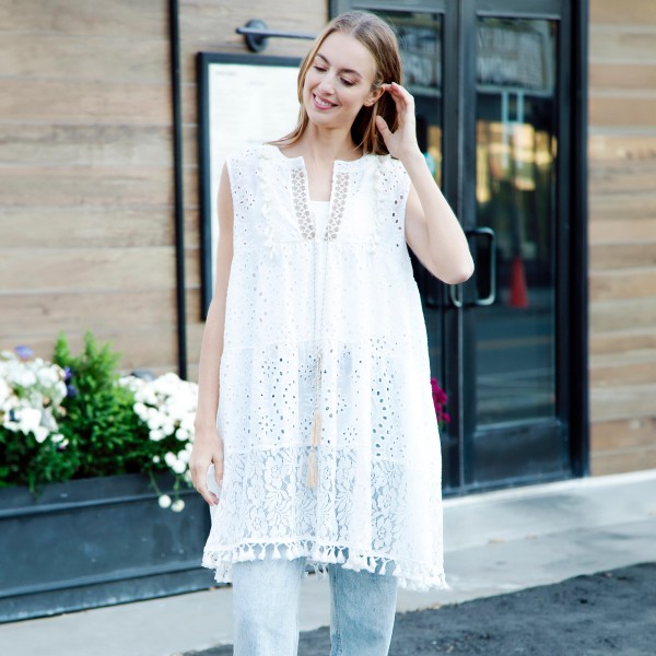 COMFYLUXE Sleeveless Eyelet And Lace Swimsuit Cover Up Dress With V-Neck & Tassel Details