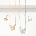 Dainty Chain Link Necklace Featuring Metal Tone Butterfly Pendent With Stud Earrings