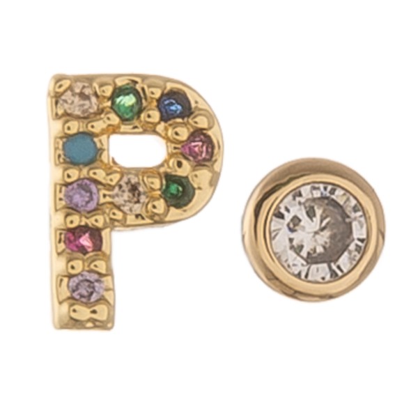 Dainty 16k Gold dip plated cubic zirconia initial P mix match stud earrings.
