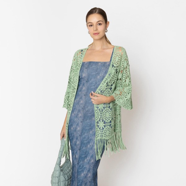 Do Everything In Love Flower Pattern Open Knit Kimono With Fringe Detail