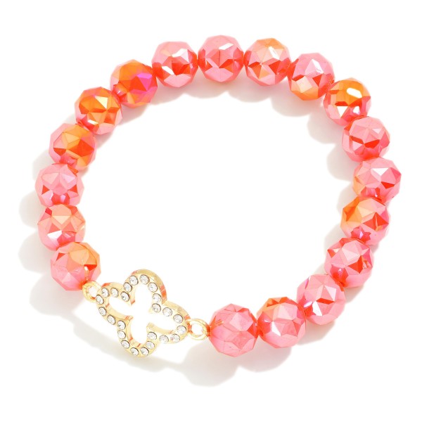 Faceted Glass Bead Stretch Bracelet Featuring Rhinestone Clover Charm
