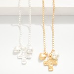 Flat Ball Chain Necklace Featuring Hammered Metal Cross, Heart, & Pearl Pendants