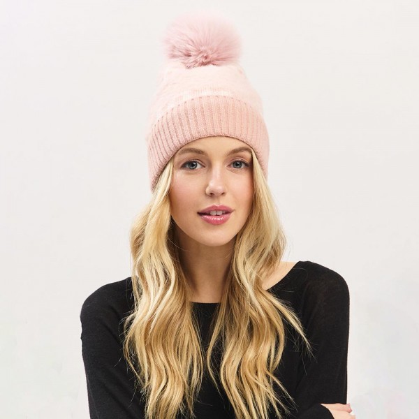 Fuzzy Cuff & Pom Beanie With Plaid Detail