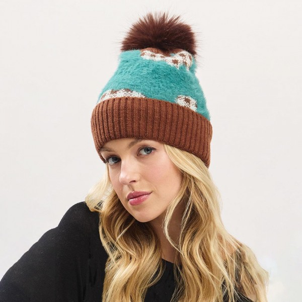 Fuzzy Cuff & Pom Beanie With Plaid Detail