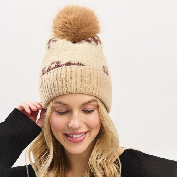 Fuzzy Cuff & Pom Beanie With Plaid Detail