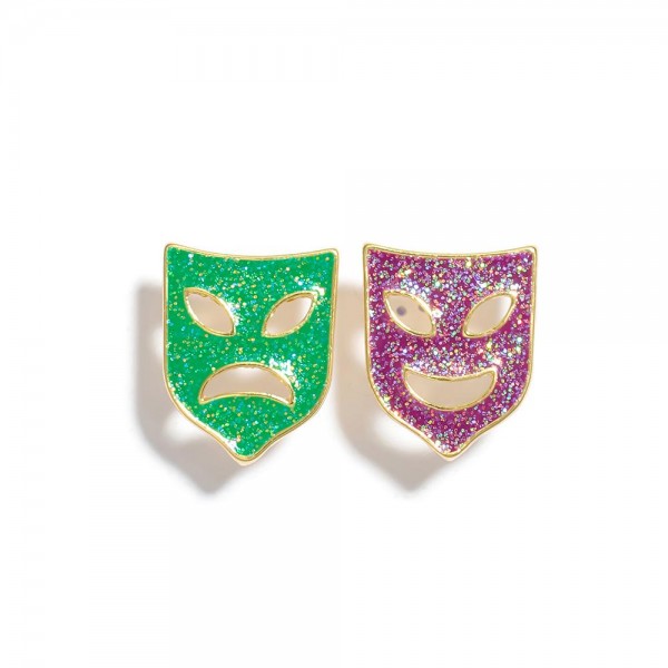 Glitter Enamel Mardi Gras Mask Post Drop Earrings