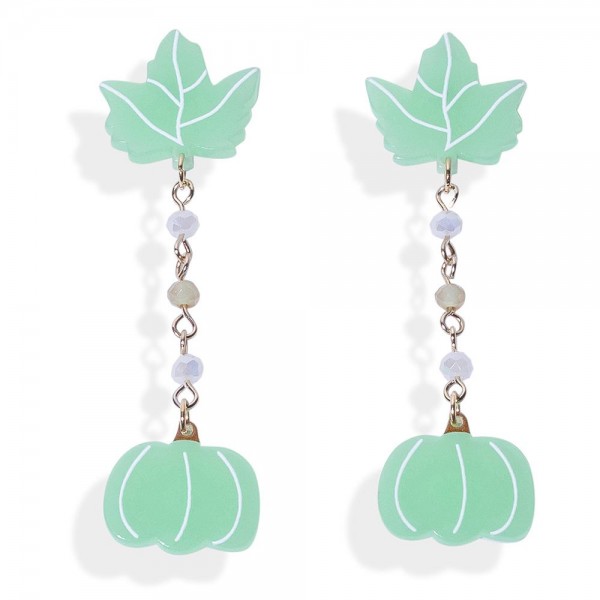 Glow in the Dark Glitter Acetate Maple Leaf and Pumpkin Drop Earrings With Faceted Bead Chain Detail