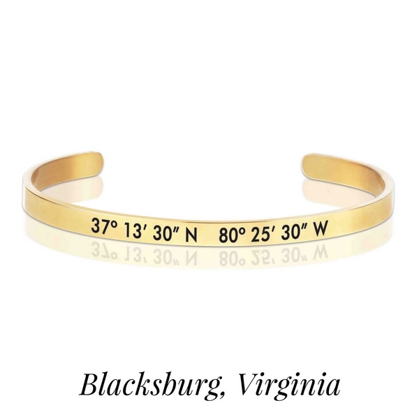 Gold tone cuff bracelet stamped with the coordinates of Blacksburg, Virginia.