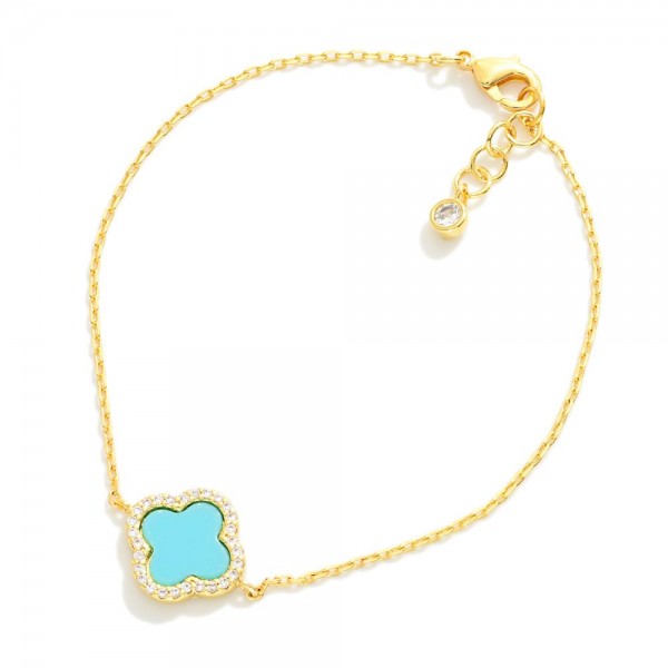 Gold Dipped Chain Link Bracelet Featuring Clover Station With Rhinestone Border