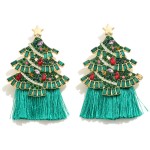 Gold Tone Enamel And Rhinestone Christmas Tree Statement Tassel Earrings