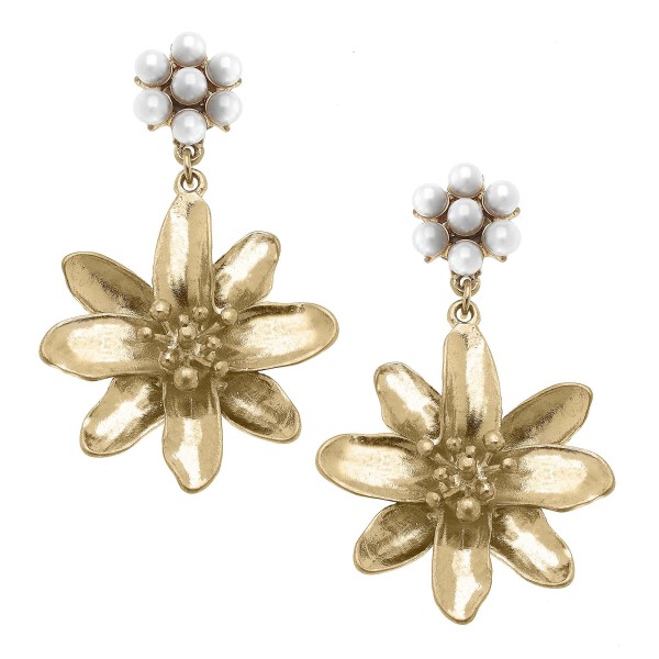 Gold Tone Flower & Pearl Cluster Drop Earrings