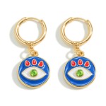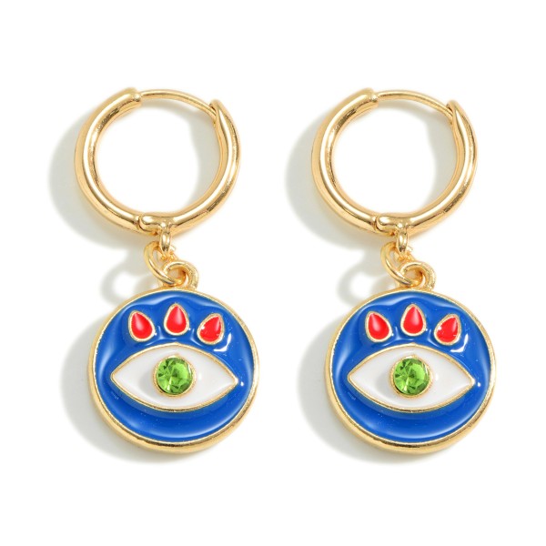 Gold Tone Huggie Hoop Earring With Enamel and Rhinestone Evil Eye Charm