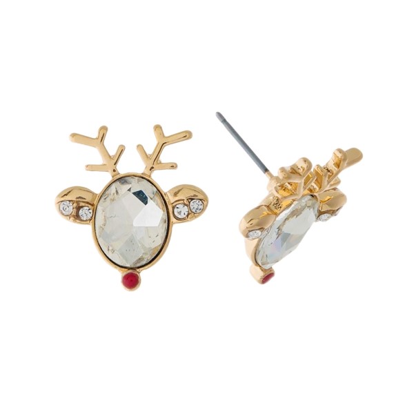 Gold tone, reindeer stud earrings with a clear rhinestone face. Approximately 3/4" in size.