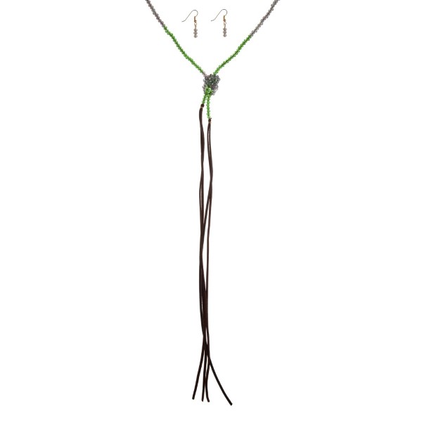 Green beaded open lariat wrap necklace with faux leather tassels. Approximately 70" in length.