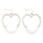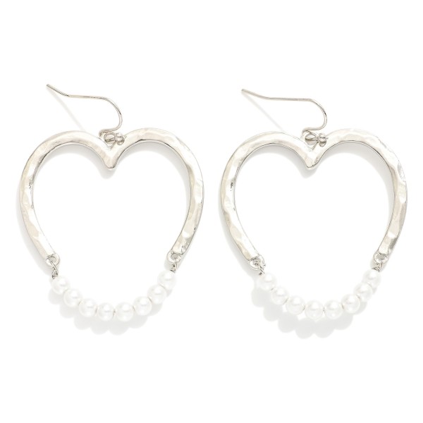 Hammered Metal Hollow Heart Drop Earrings Featuring Linked Pearl Beaded Wire Detail