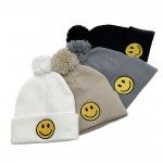 Happy Face Embroidered Knit Beanie With Yarn Pom