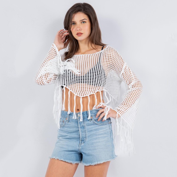 Knit Fishnet Long Sleeve Crop Top Swimsuit Cover Up With Fringe
