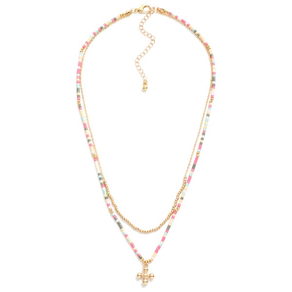 Layered Beaded and Chain Link Necklace Featuring Dainty Bead Cross Pendant