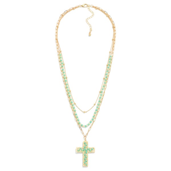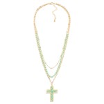 Layered Chain Link and Faceted Bead Necklace Featuring Beaded Cross Pendant