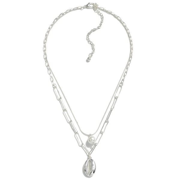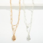 Layered Chain Link Necklace Featuring Metal Puka Shell and Pearl Pendants
