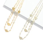 Layered Pearl Beaded Chain Link Necklace Featuring Rhinestone & Metal Tone Flower Stations
