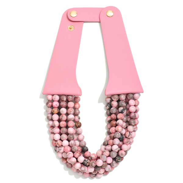 Layered Semi Precious Stone Beaded Necklace With Vegan Leather Snap Strap