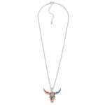 Layered Silver Chain Link Necklace Featuring Colorful Western Cow Skull Pendant