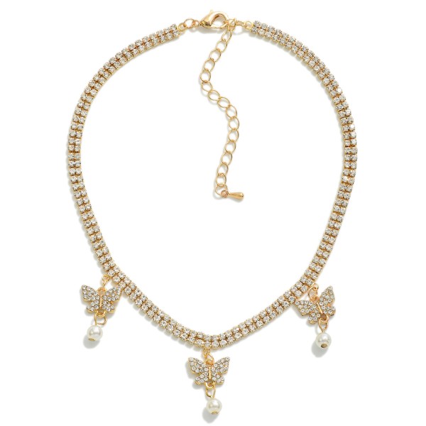 Linked Rhinestone Choker Necklace Featuring Butterfly and Pearl Charms