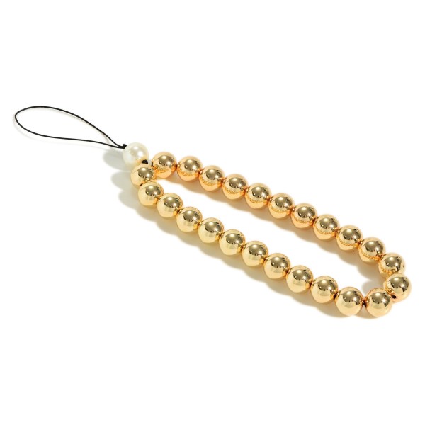 Metal Tone Beaded Cell Phone Strap With Pearl Accent