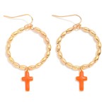 Metal Tone Beaded Hoop Drop Earrings Featuring Enamel Cross Dangle