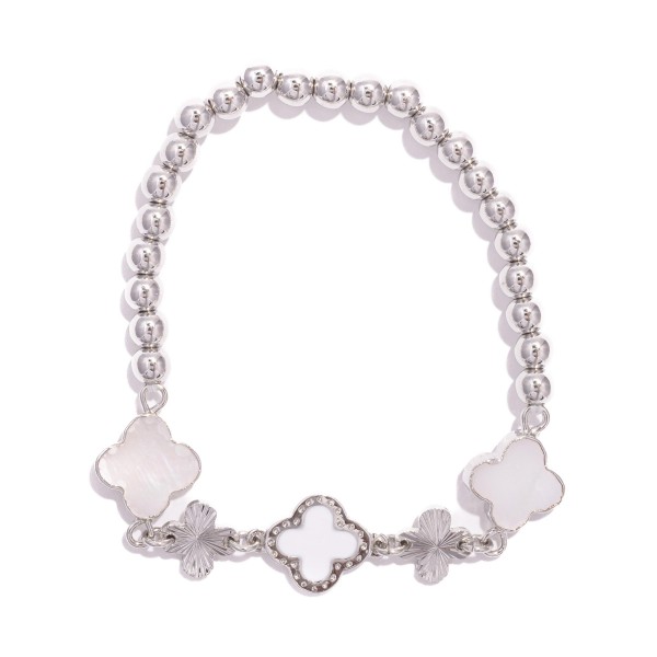 Metal Tone Beaded Stretch Bracelet Featuring Enamel & Acetate Clovers