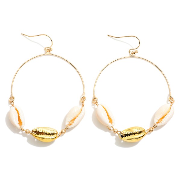 Metal Tone Drop Hoop Earrings Featuring Linked Cowrie Shells