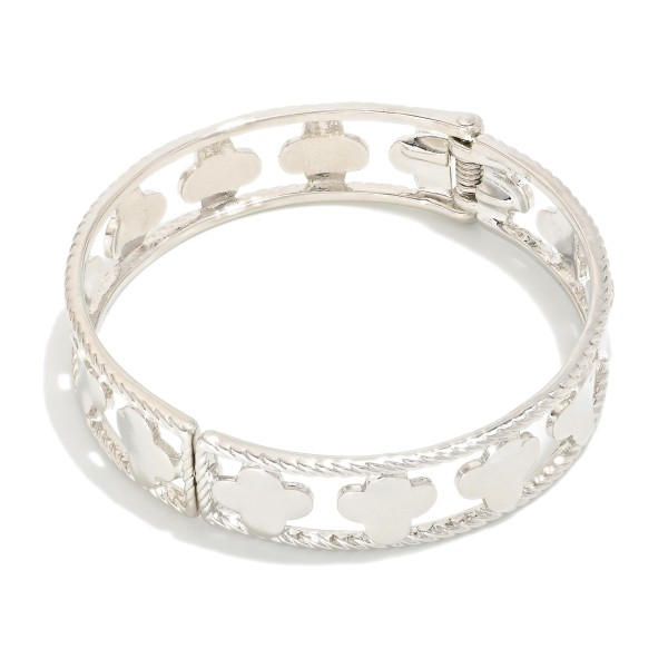 Metal Tone Hinged Cuff Bracelet Featuring Clover Accents