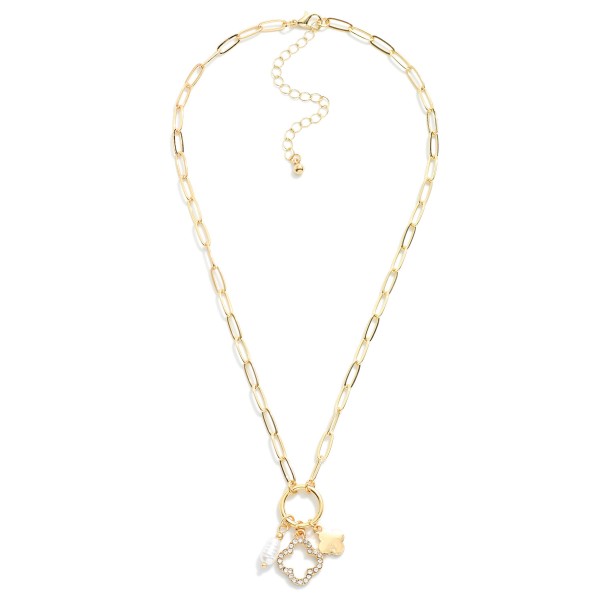 Metal Tone Paper Clip Chain Charm Necklace Featuring Clovers & Pearls